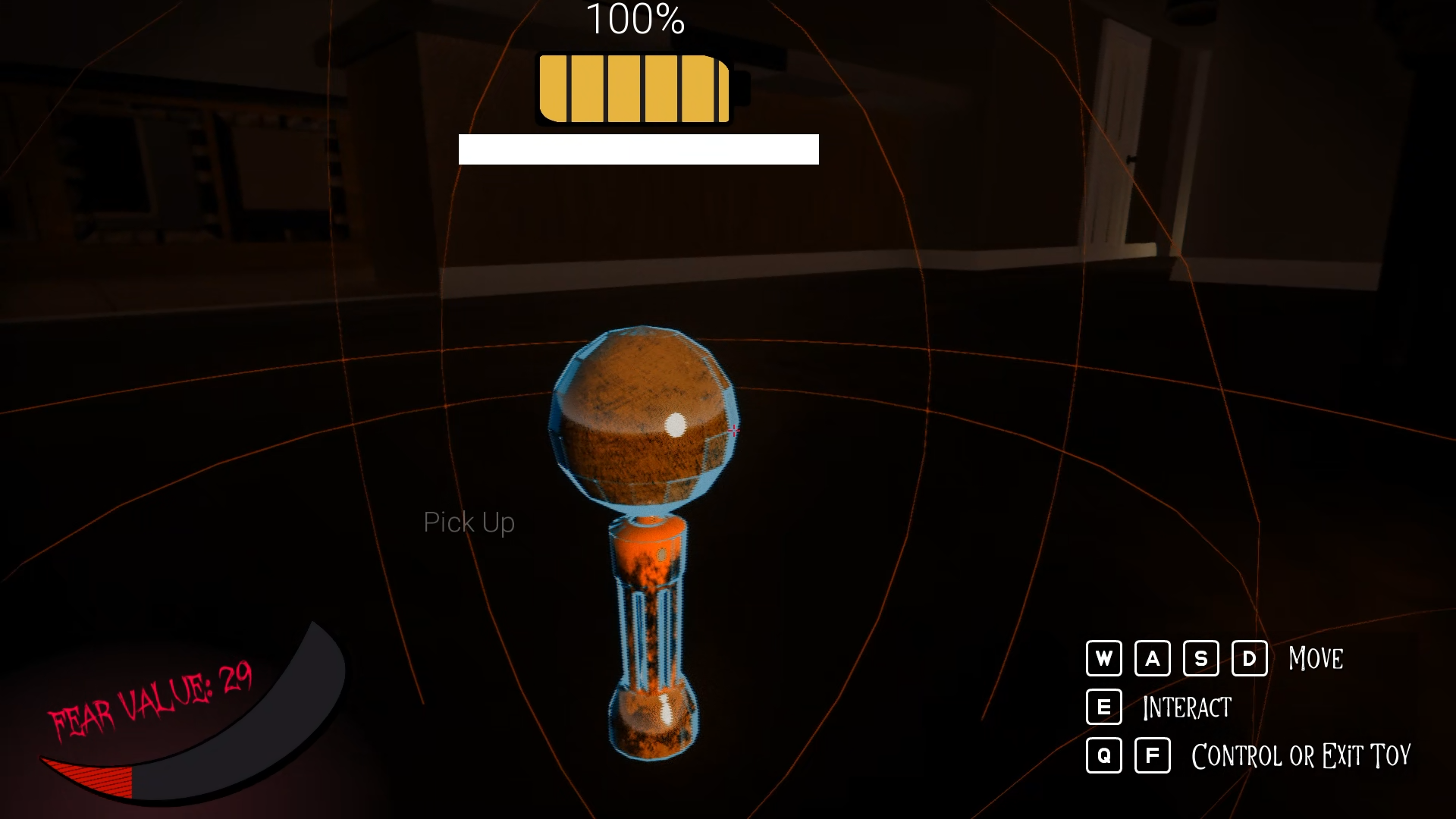 Use the toys that are scattered across the room to make your way to the door on the far end of the house! Watch out for your Fear meter because once its full, it's lights out! Using toys will sometimes emit light that'll help restore your Fear meter.